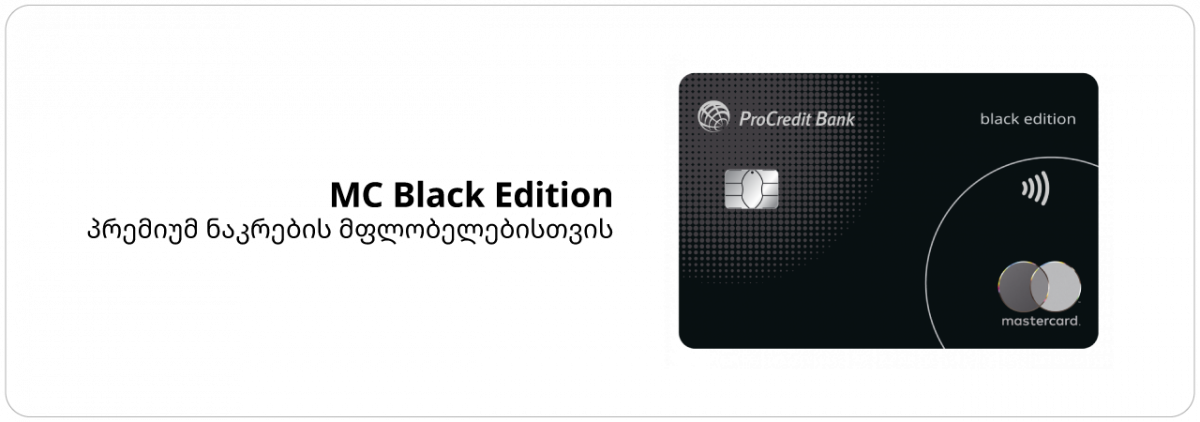 პრემიუმ ნაკრების მფლობელებისთვის Mastercard Black Edition პრემიულური კლასის ბარათი უკვე ხელმისაწვდომია. შეუკვეთე ბარათი უფასოდ, ისარგებლე გამარტივებული საბანკო სერვისებით და ბარათის ექსკლუზიური შეთავაზებებით, როგორც ლოკალურად, ასევე საერთაშორისო მასშტაბით.